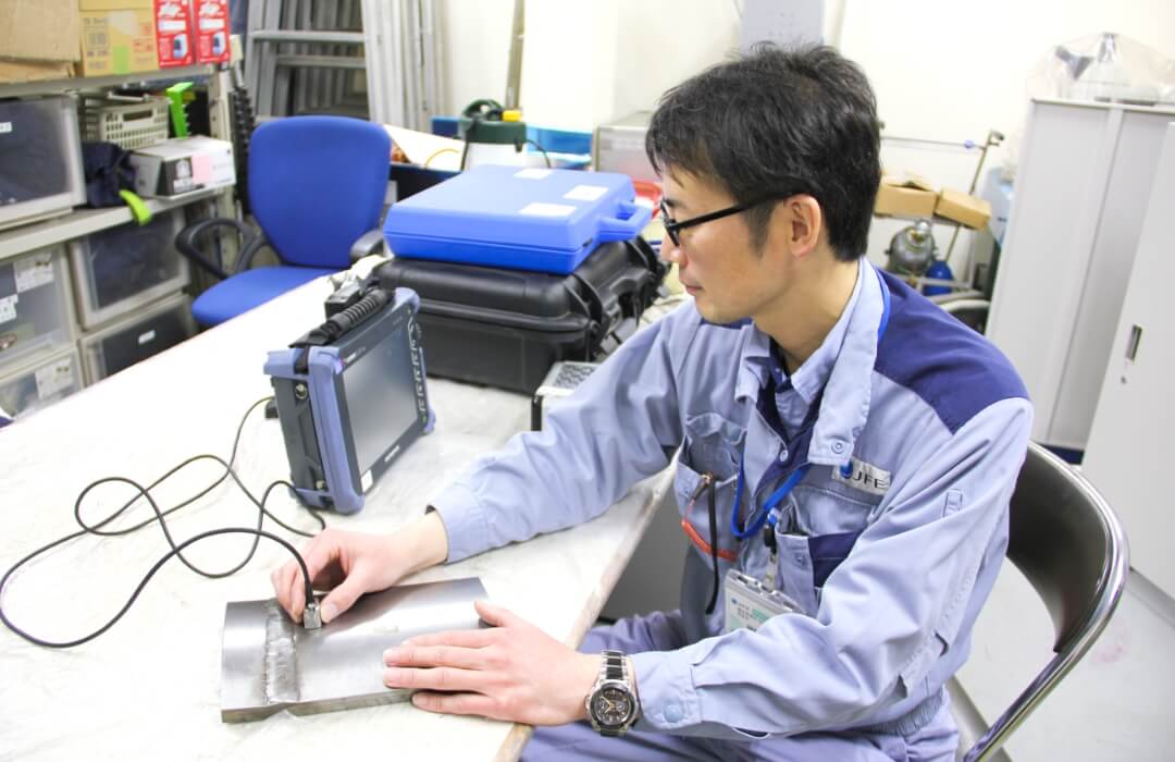 JFEエンジニアリング(株)鶴見製作所での製作品の非破壊検査や、首都高速道路、ガスパイプライン、風車、タービン等社会インフラの検査及び調査を担当しています。また緊急案件の詳細調査等も担当しています。